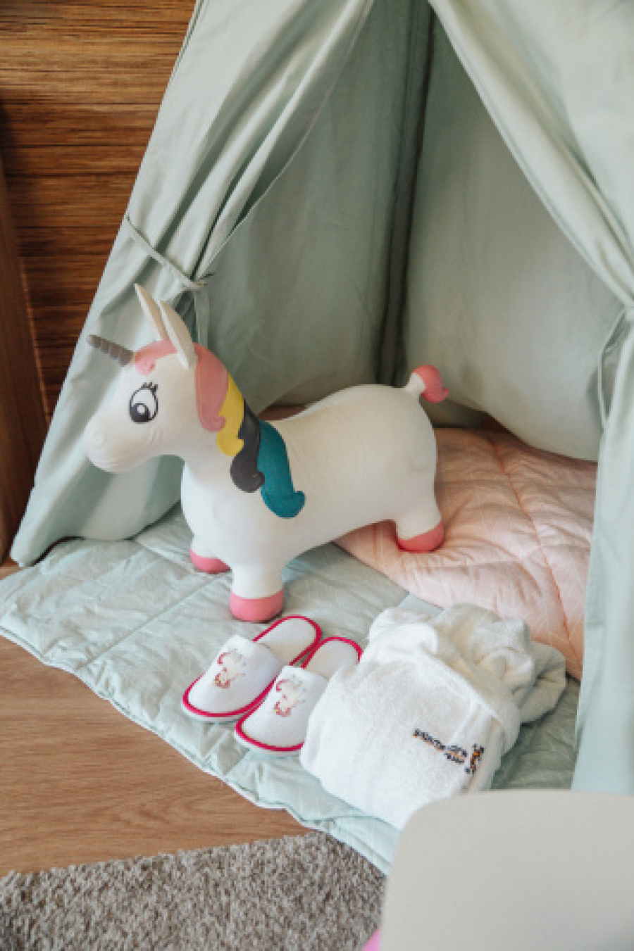 postieľku. Návštevníkom rodinných izieb sa po roztvorení závesov naskytne výhľad buď na scenériu